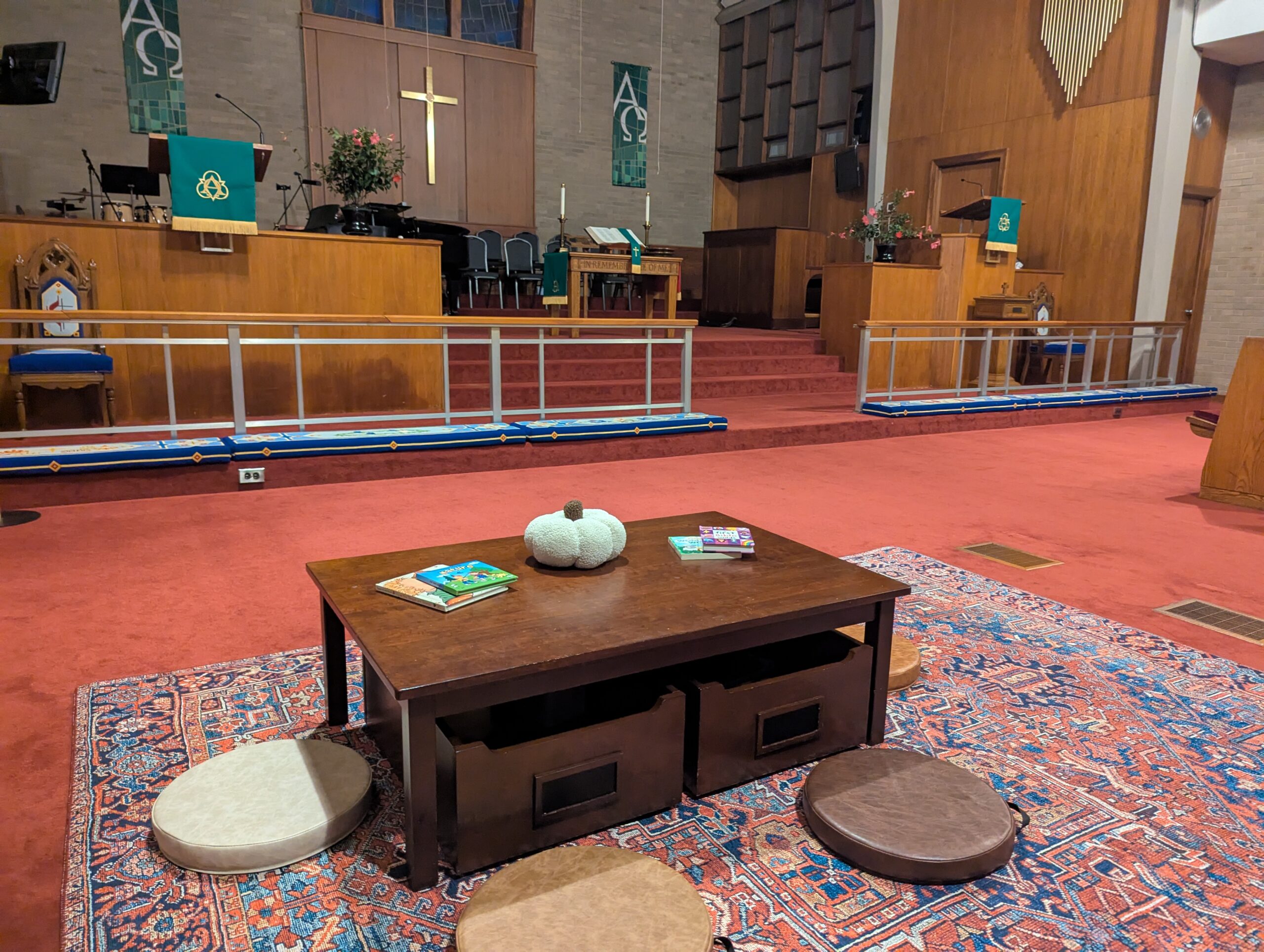 The PRAYground is an area at the front of our sanctuary for children to come play, pray, and participate in worship. Families with young children are invited to sit in the pews behind the PRAYground and enjoy having a spot for their little ones to experience worship. There are quiet toys for them to explore, books to look at, and ribbons or scarves to wave during their favorite songs. You may be wondering why the PRAYground is at the front of the sanctuary. Children pay more attention when they can see what’s going on! We truly want to give our youngest disciples the opportunity to absorb what they see, hear, and feel during worship.